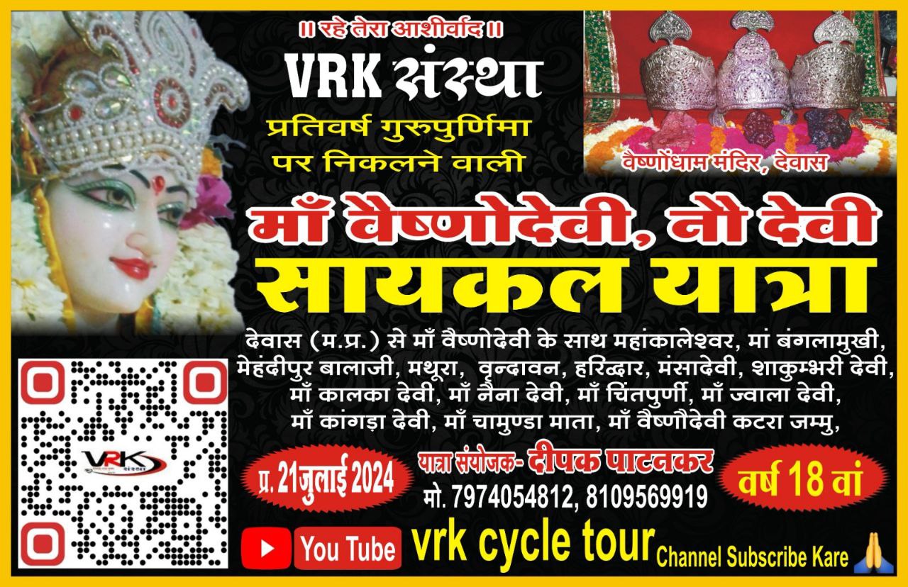 कितना जोश है इन मां के भक्तों में कि वह 17 वर्ष से साइकिल से देवास से मां वैष्णो देवी के दरबार में पहुंचकर मां की पूजा आराधना का दर्शन करने के साथ कुछ विशेष संदेश लेकर भी जाते हैं समाज सुधार के और इस वर्ष भी ऐसे ही माँ वैष्णो देवी की 18वीं साइकिल यात्रा 21 जुलाई को रवाना होगी। भाजपा नेतालोकेश विजयवर्गीय ने बताया कि प्रतिवर्षानुसार इस वर्ष से भी वी.आर.के. संस्था की 18वीं साइकिल यात्रा अध्यक्ष दीपक पाटनकर के सानिध्य में 21 जुलाई रविवार को प्रात: 11 बजे महाकाल कॉलोनी वैष्णो देवी धाम मंदिर से प्रारंभ होगी। यात्रा उज्जैन महाकालेश्वर, नलखेड़ा बगलामुखी मंदिर, मेहंदीपुर बालाजी, मथुरा, वृंदावन, हरिद्वार, मनसा देवी, शाकंभरी देवी, मां कालिका देवी, मां नैना देवी, मां चिंतपूर्णी, मां ज्वाला देवी, मां कांगड़ा देवी, मां चामुंडा माता, कोटा, भरतपुर, अलीगढ़, दिल्ली, हरिद्वार, धर्मशाला हिमाचल प्रदेश होते मां वैष्णो देवी पहुंचेगी। यात्रा का मुख्य उद्देश्य रक्तदान करके जीवन बचाए, स्टाफ टीम बनाकर पानी बचाए जैविक खेती अपनाकर धरती बचाएं, पौधे लगाकर पर्यावरण बचाएं, योग करके स्वस्थ रहिए, बेटी बचाओ-बेटी पढ़ाओ, स्वच्छ भारत स्वस्थ भारत, नशा मुक्त भारत, पहली रोटी गाय आदि को लेकर निकाली जा रही है।