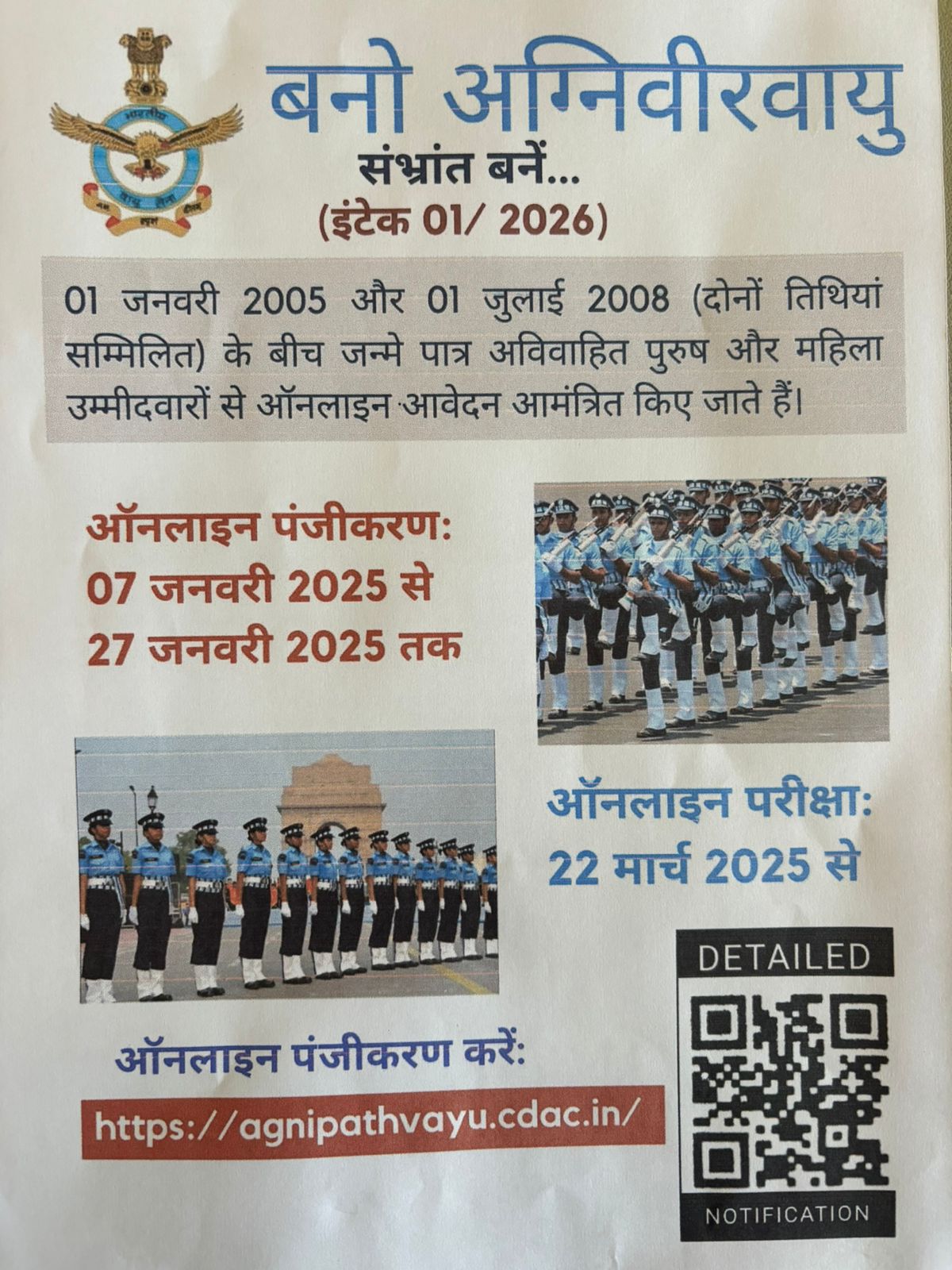 युवाओं के लिए सुनहरा मौका,भारतीय वायु सेना अग्निपथ योजना के अन्तर्गत अग्निवीर वायु भर्ती के लिए आवेदक 27 जनवरी कर सकते हैं आवेदन